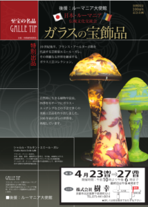 2026年3月25日 ガレ展 開催! 平素は格別のお引き立てを賜り、ありがたく厚く御礼申し上げます。 この度4月23日(木)~4月27日(月)まで弊社特設会場にて 「ガレ展」を開催します。 ぜひご来場くださいますようお願いいたします。